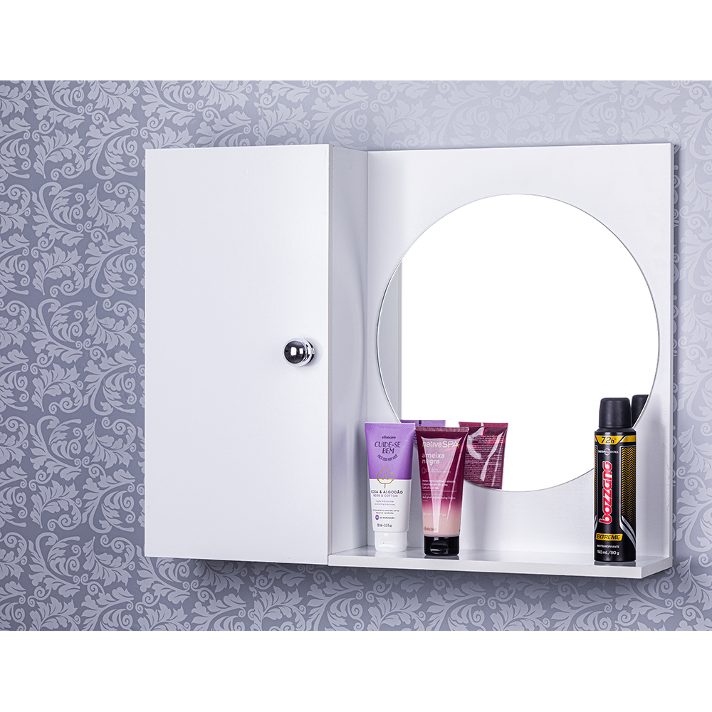 Armário Para Banheiro Com Espelho Redondo cor Branco Com Porta Que Fecha Suave é a escolha perfeita para quem busca elegância, sofisticação e praticidade para seu banheiro.