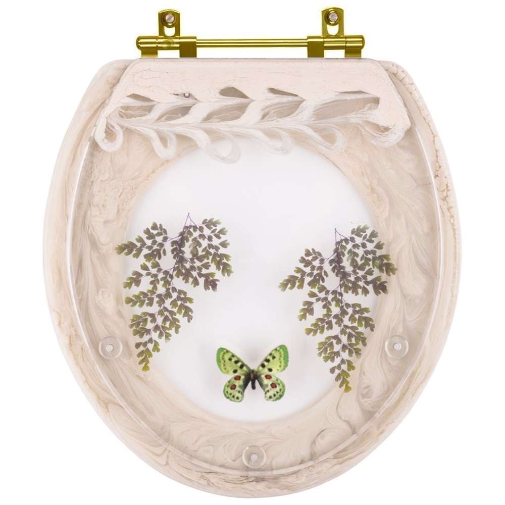 O Assento Sanitário Decorado Oval Convencional Areia Com Borboleta verde para todas as marcas Com Ferragem Dourada é a opção ideal para quem busca combinar funcionalidade com elegância em seu banheiro.