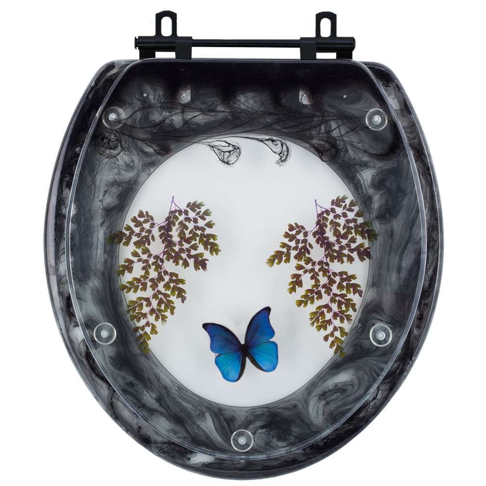 O Assento Sanitário Decorado Oval Convencional Preto Com Borboleta Azul com Ferragem Preta é a opção ideal para quem busca combinar funcionalidade com elegância em seu banheiro.