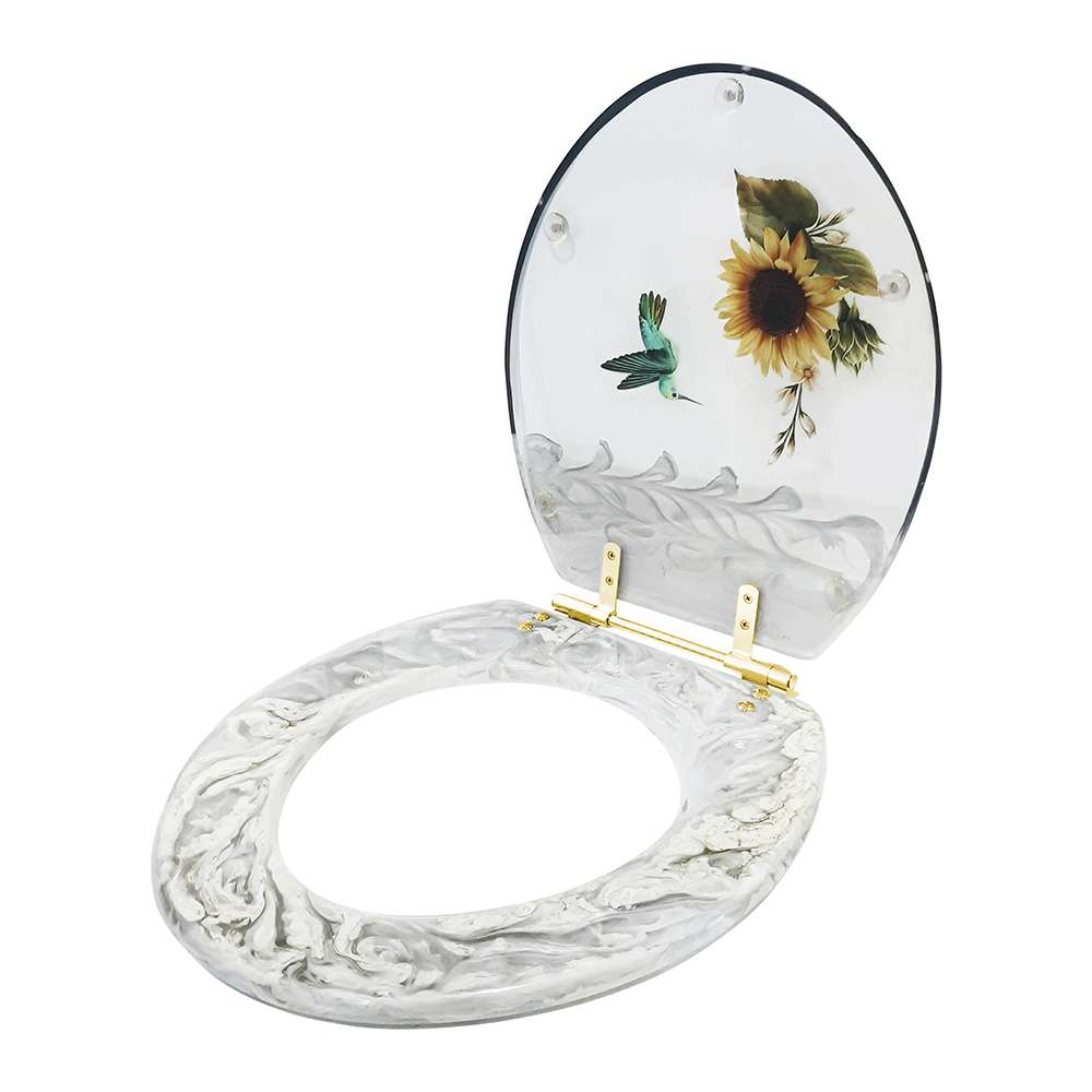O Assento Sanitário Poliester Decorada Convencional Girassol Beija Flor Com Ferragem Dourada é a opção ideal para quem busca combinar funcionalidade com elegância em seu banheiro.