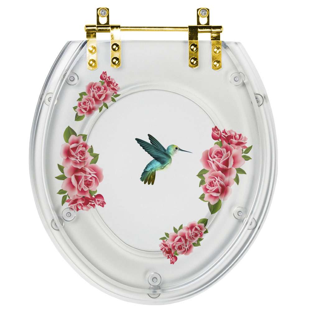 O Assento Sanitário Poliester Decorada Convencional Transparente Beija Flor Com Ferragem Dourada é a opção ideal para quem busca combinar funcionalidade com elegância em seu banheiro.