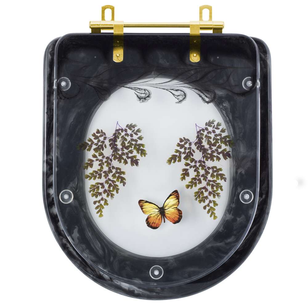 O Assento Sanitario Poliester Decorado Borboleta Amarela Carrara Preto com Ferragem Dourada é a opção ideal para quem busca combinar funcionalidade com elegância em seu banheiro.