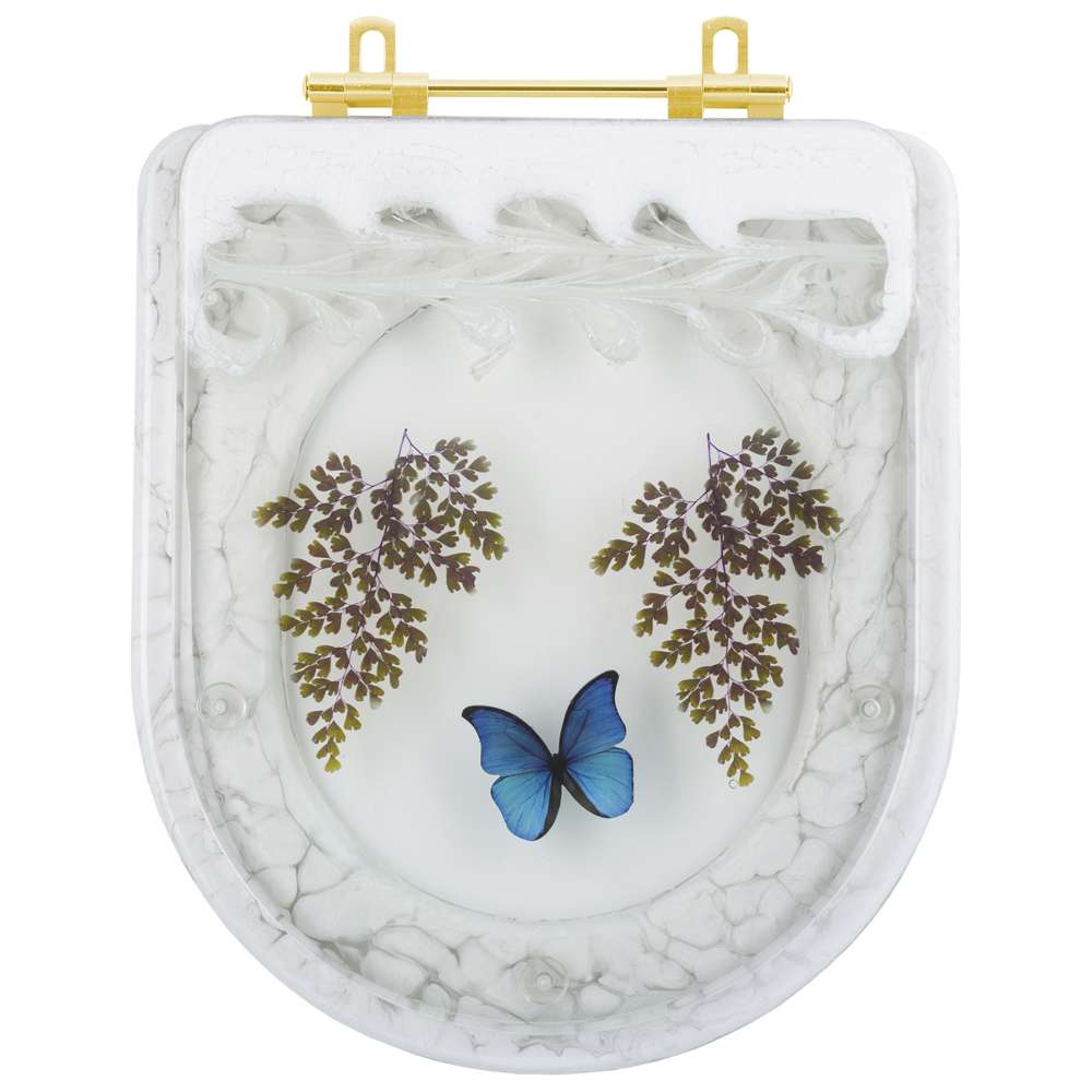 O Assento Sanitario Poliester Decorado Borboleta Azul Carrara para vaso Deca com Ferragem Dourada é a opção ideal para quem busca combinar funcionalidade com elegância em seu banheiro.