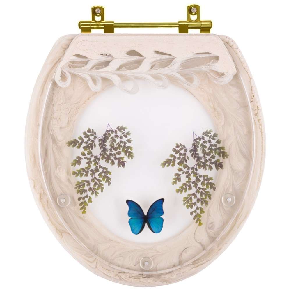 O Assento Sanitário Poliester Oval Areia Decorado Borboleta Azul Com Ferragem Dourada é a opção ideal para quem busca combinar funcionalidade com elegância em seu banheiro.