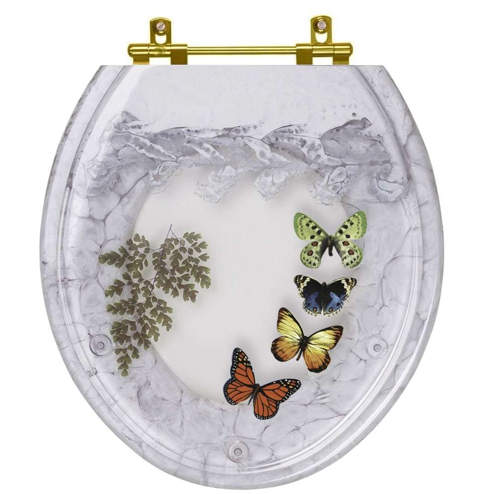 O Assento Sanitário Poliester Oval Branco Decorado Borboletas Com Ferragem Dourada é a opção ideal para quem busca combinar funcionalidade com elegância em seu banheiro.