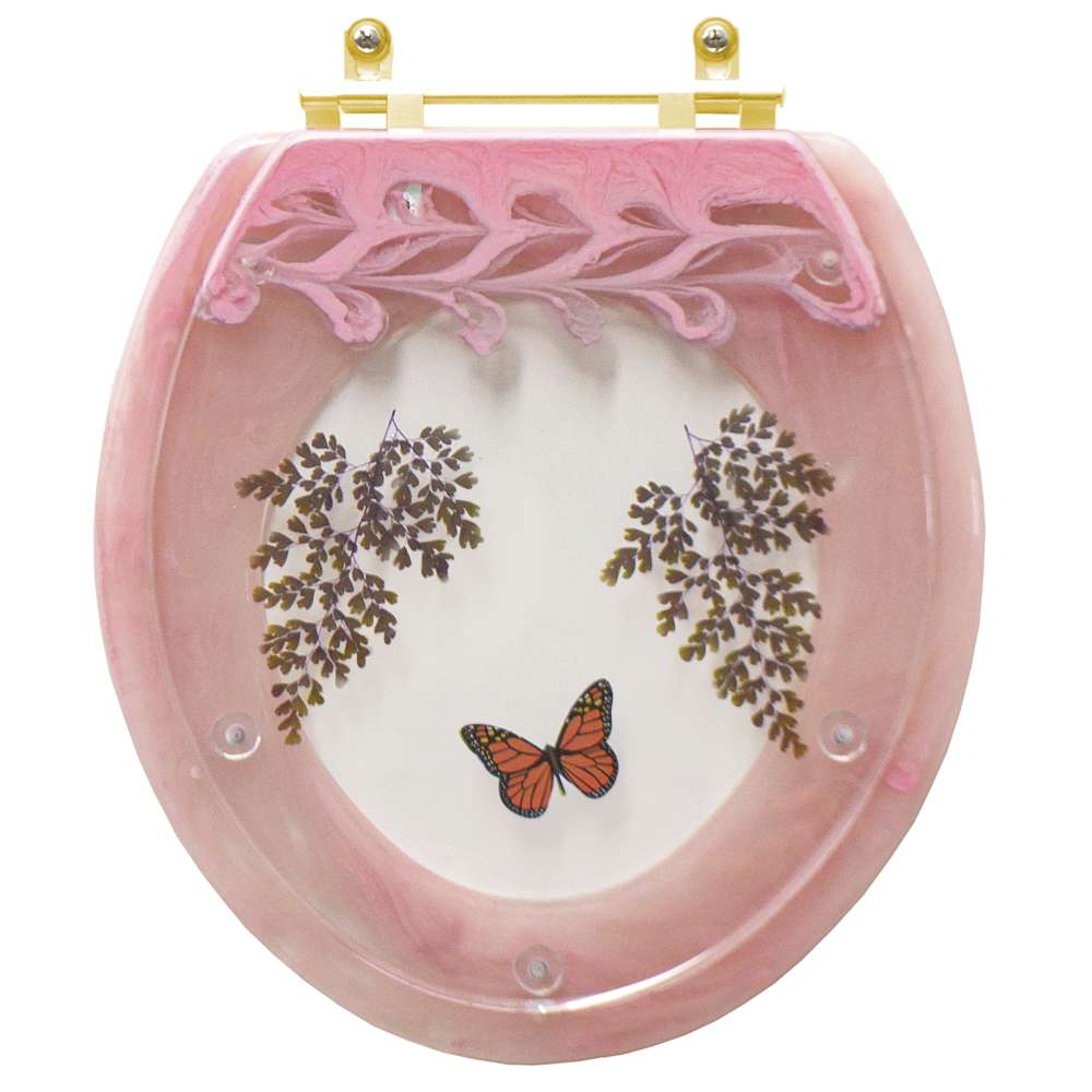 O Assento Sanitário Poliester Oval Rosa Quartzo Decorado Borboleta Vermelha Com Ferragem Dourada é a opção ideal para quem busca combinar funcionalidade com elegância em seu banheiro.