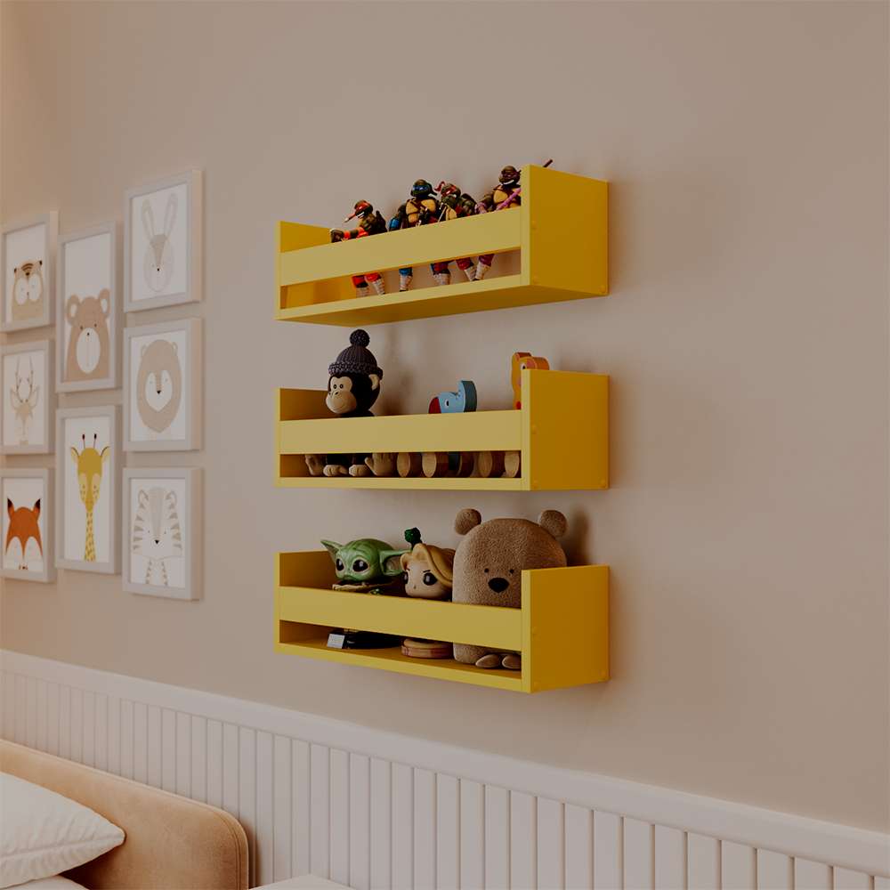 Kit 3 Prateleiras Porta Brinquedos Amarela 70 x 12cm Suporte Invisivel é perfeita para tornar o seu ambiente mais criativo e moderno.