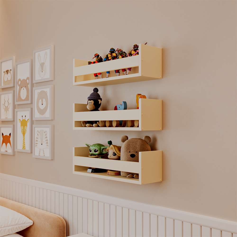 Kit 3 Prateleiras Porta Brinquedos Bege Claro 60 x 12cm Suporte Invisivel é perfeita para tornar o seu ambiente mais criativo e moderno.