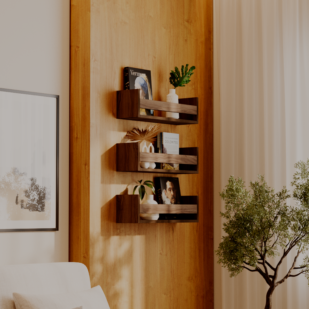 A Kit 3 Prateleiras Porta Objetos Nogal 60 x 12cm Suporte Invisivel é perfeita para tornar o seu ambiente mais criativo e moderno.