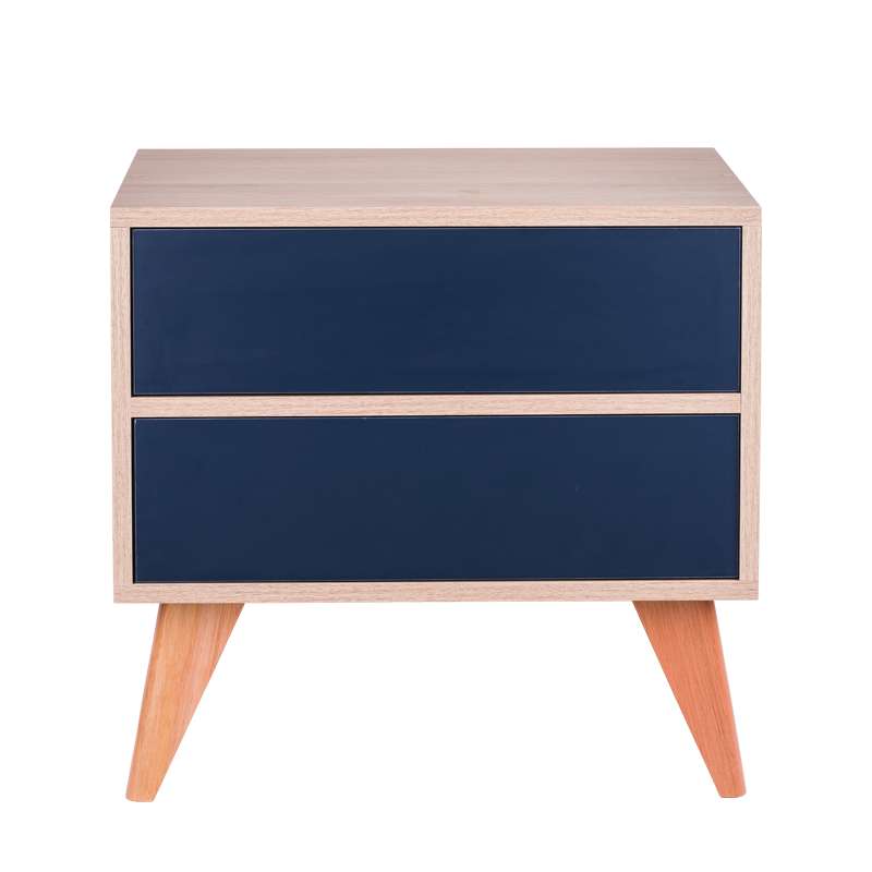 Mesa de Cabeceira Retrô Modelo Bréscia na cor Carvalho Treviso (Madeira Clara) e portas Azul Marinho traz organização com estilo para o seu quarto. Possui lindos pés torneados em diagonal.