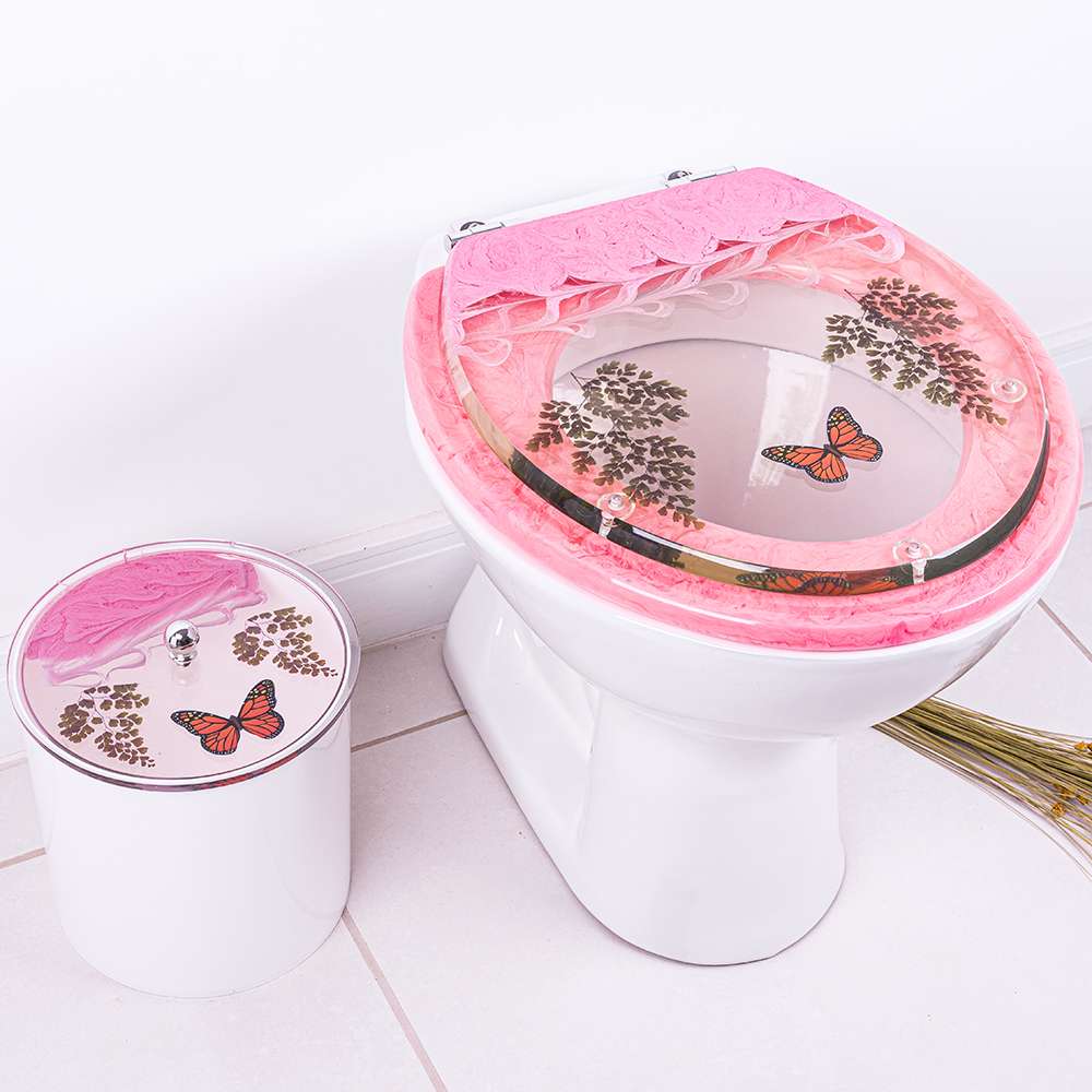Assento Sanitário fabricado em resina virgem de Poliéster com decoração de Avenca e Borboleta inédita e exclusiva e com acabamento de superfície polido de alto brilho.
