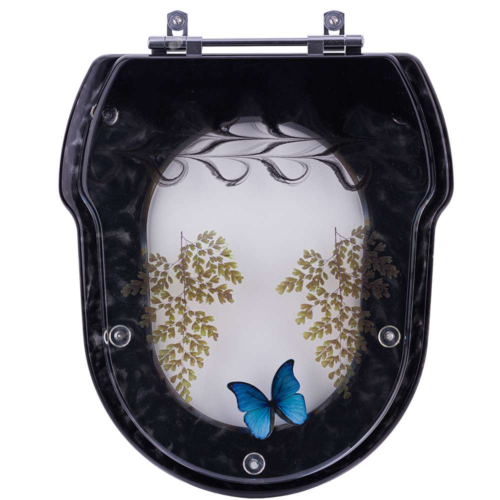 Tampa De Vaso Hampton Decorada com Borboleta Azul e Avencas e, detalhe marmorizado Preto Para Louça Incepa é a escolha perfeita para seu banheiro. O Assento Sanitário Poliéster é considerado o melhor tipo de assentos sanitários do mercado pelo seu acabamento impecável e excelente durabilidade.