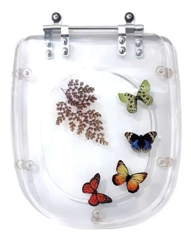 Tampa de Vaso Sanitário Poliéster Sabatini Cristal Decorado com 4 borboletas para bacia Icasa é a escolha perfeita para seu banheiro trazendo beleza e praticidade.
