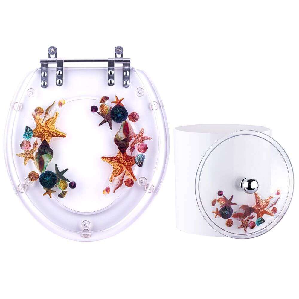 Kit contendo 1 assento sanitário decorado Fundo do Mar e 1 lixeira na mesma decoração. Escolha perfeita para completar seu banheiro. Assento Sanitário em resina de poliester, material semelhante ao acrílico só que mais robusto / resistente. É totalmente impermeável. O assento (parte onde senta) é transparente em resina translucida. A tampa é transparente com decoração de Fundo do Mar. A decoração é uma transparência que fica dentro da resina, não sai e não desbota com a limpeza diária. Lixeira decorada com tampa em resina de poliester, no mesmo material e decoração do assento sanitário. O corpo da lixeira é em plástico polipropileno, muito resistente e fácil de limpar. Medidas do assento sanitário: 43cm comprimento x 38cm largura x 15cm distancia entre os parafusos. É compatível com vasos sanitários de modelo convencional / oval / universal. Medidas da lixeira: 20cm altura x 20cm largura