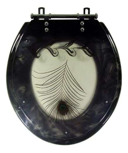 Assento Sanitário fabricado em resina virgem de Poliéster com decoração de Pavão inédita e exclusiva e com acabamento de superfície polido de alto brilho.