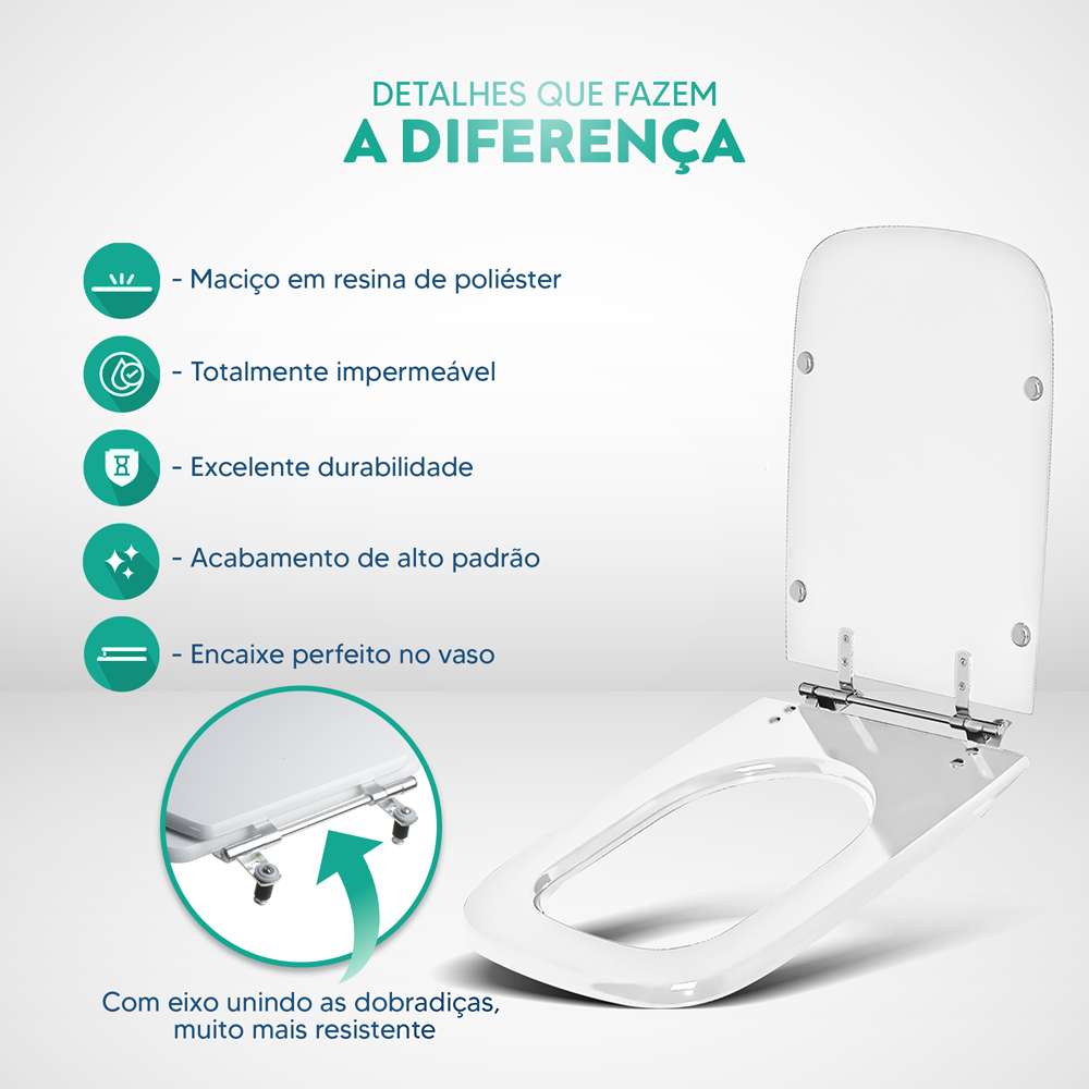 Limpeza: recomenda-se a limpeza do assento sanitário poliéster com água e sabão neutro, não utilizar produtos abrasivos.