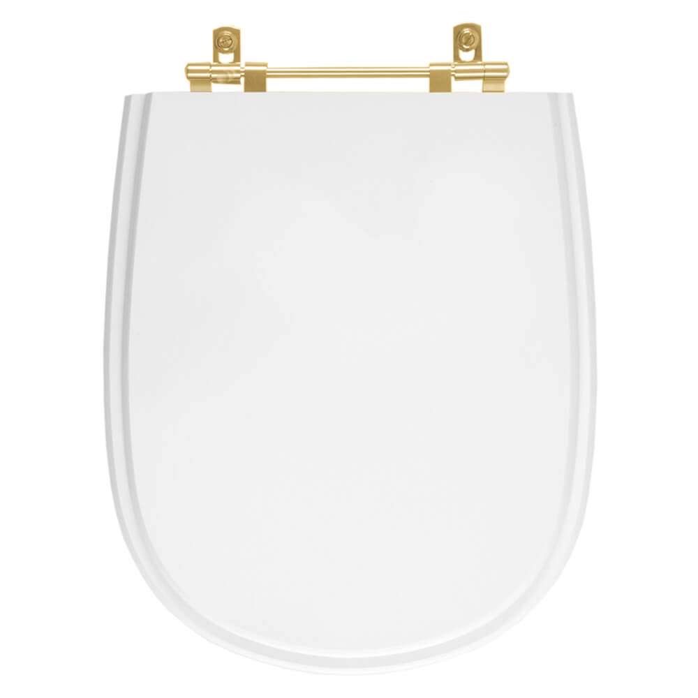 Itens inclusos: assento e tampa de resina de poliéster e ferragem completa na cor dourada. Produto completo, pronto para instalar no vaso sanitário.