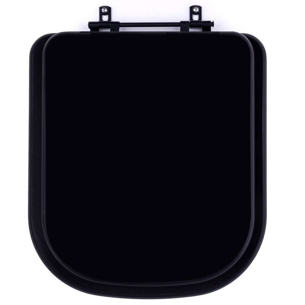 Assento sanitário maciço em resina de poliéster com perfeito acabamento. Cor preto fosco no padrão da louça Deca ebano (preto) fosco. Ferragem metálica em alumínio anodizado, que não oxida.
